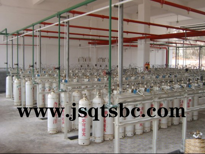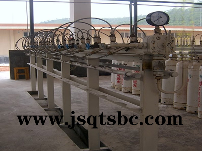 充灌氧气时在进入集容管前,下部装有气水分离器一个,以便及时在充瓶前分离氧气中的水份,净化氧气的纯度。防倒链是用于围圈氧瓶起固定作用的。气体汇流排是将数个气瓶分组汇合后进行减压,再通过主管道输送至使用终端的系统设备,主要用于中小型气体供应站以及其它适用场所。